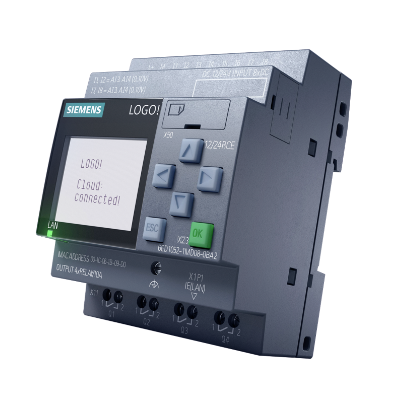 Módulo lógico, alimentación de pantalla / E/S: 12/24 V CC/relé, 8 DI (4 AI)/4 DO, memoria de 400 bloques, ampliable modularmente, Ethernet.